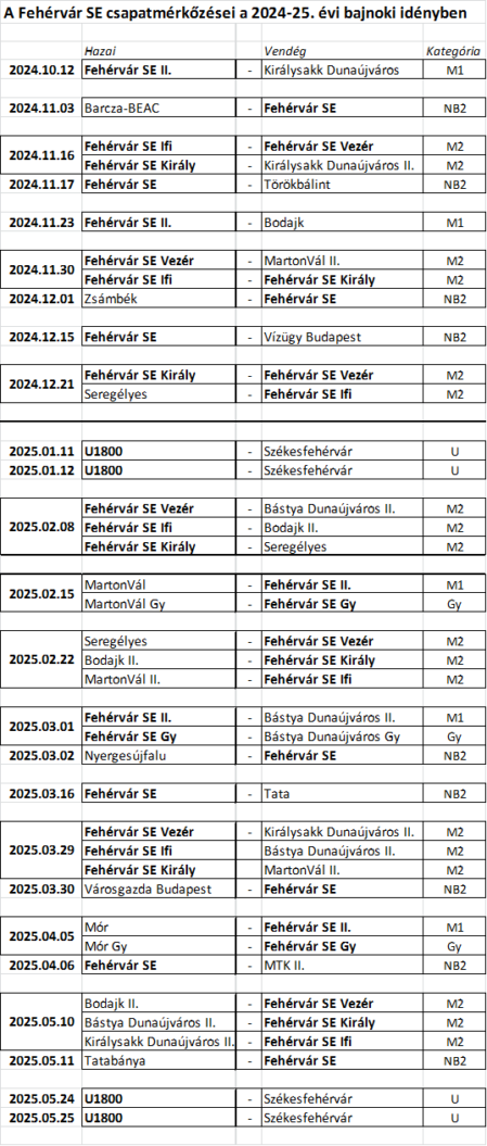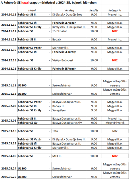 1. Szeptember 6-án, pénteken 18 órától FSE elnökségi ülést tartunk az Emlékházban. (Meghívó csatolva.) Megjelent a FSE NB2-es csapatának besorolása és menetrendje: https://chess.hu/ csapatbajnoksagok/?b=322. A Fejér megyei sakk csapatbajnokság (M1, M2, Gy) sorsolása szeptember végén várható, közzé fogjuk tenni.
